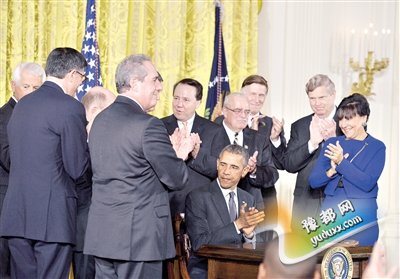 6月29日,在美国首都华盛顿白宫,美国总统奥巴马在签署法案后鼓掌。美国总统奥巴马6月29日签署贸易促进授权法案,给予美国政府“快速道”授权。此举赋予美国政府在未来的国际贸易协议谈判中更多的权力,有利于推动跨太平洋战略经济伙伴协定(TPP)等谈判取得进展。这将从经济层面为美国开展“亚太再平衡”战略作重要布局,并为总统任期只剩一年半的奥巴马再添一枚政绩勋章。