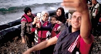 乘坐橡皮艇抵达希腊莱斯沃斯岛的叙利亚难民掏出手机自拍。欧盟分歧或致更多难民死亡