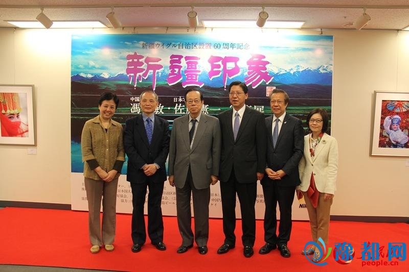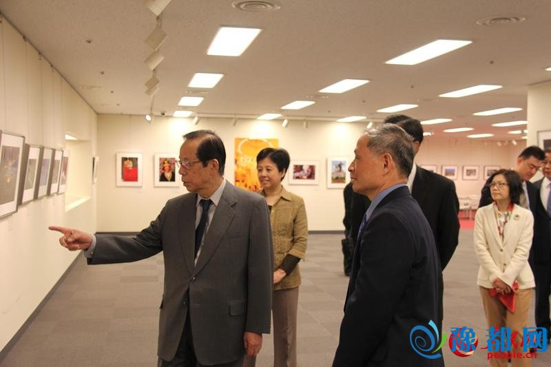 日本前首相福田康夫(左一)参观“新疆印象”摄影展 贾文婷摄