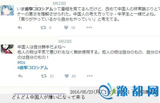 首先来看日本民众的反应,虽然有一些日本民众对这一电视节目提出批评,认为节目有煽动民族歧视的可能,但是大多数日本民众的反应令人担忧。有人说“看完节目后更加讨厌中国人了”,也有人说“这个节目让我再次认识到了中国人常识和公德的缺乏,思考问题的方式就像中小学生一样”,还有人说“中国人太过想当然,随便用他人的东西,自己的东西是自己的,别人的东西也是自己的”。