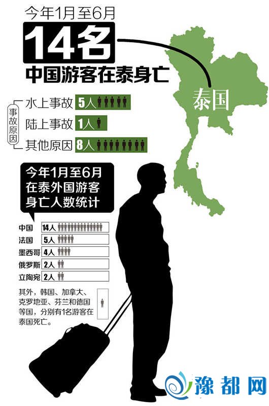 据泰国《星暹传媒》6月16日报道,今年1月至6月,在泰外国游客伤亡数字最高的前五位,中国游客的死亡数字列于首位,计14人,死亡事故分别是水上事故致死5人、陆上事故致死1人,还有8人为其他原因死亡。