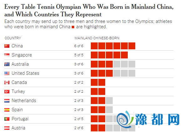 图注:每个国家最多都只能向里约奥运派出男女各三名乒乓球选手【环球网综合报道】美国《纽约时报》8月17日称,众所周知,中国乒乓球水平远远领先于其他国家。面对国内激烈竞争,许多中国出生的运动员为了职业发展和逐梦奥运,纷纷选择入籍他国,转战海外,而现在此现象已极大的改变了这项运动的面貌。