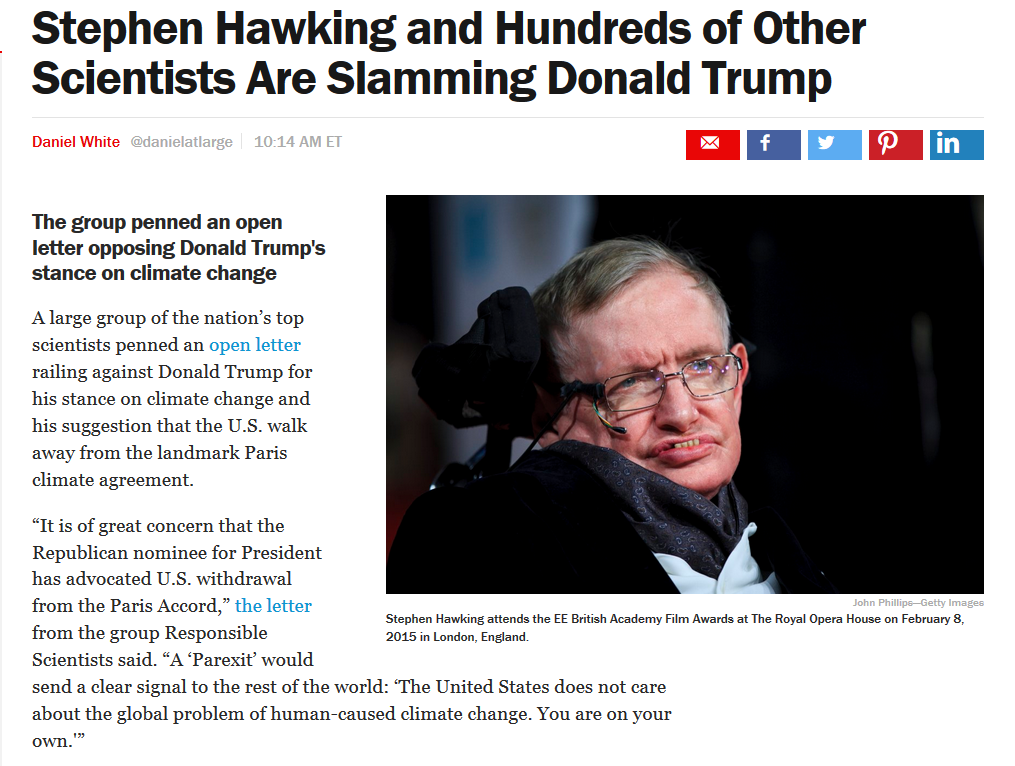 美国时代周刊网站截图 包括30名诺贝尔奖得主和霍金等著名科学家在内的375名美国国家科学院院士联名反特朗普