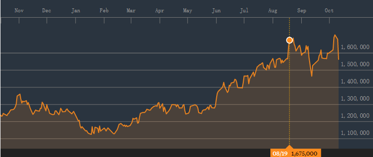 韩元兑美元1年以来走势每日经济新闻记者对比三星电子股价和韩元兑美元的走势图后发现,长期以来,尤其是今年5月之后,两者大体走势基本一致。截至10月10日,2016年以来韩元兑美元上涨了约6.11%。