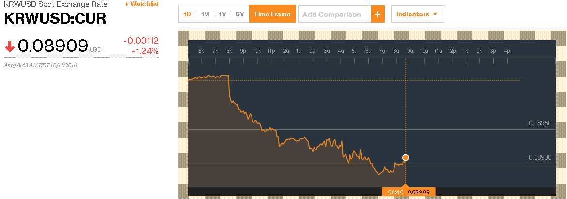然而,北京时间10月11日早晨,三星发布要求用户暂停使用Note 7手机并关机的消息后不久,韩元兑美元出现急促暴跌,并在全天一路下行,最多跌幅逾1.5%,后略有回升,截至北京时间20:30,韩元兑美元跌幅为1.24%,报0.08909。