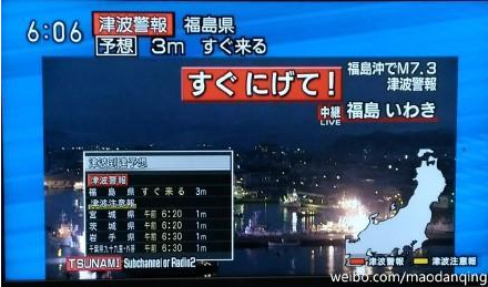 徐静波微博:日本时间5时59分,福岛县近海发生7.3级地震,海啸高度有3米,日本气象厅呼吁沿海地段立即避难!