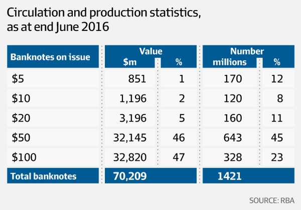 根据澳大利亚联储公布的数据,占澳大利亚流通金额比例高达92%的货币面值为50澳元和100澳元,但这些大面额纸币在实际流通中并不常见,因此有人怀疑这些钱实际被用于非法活动。