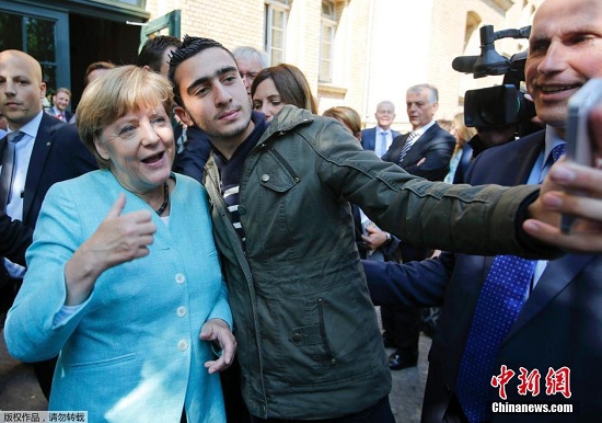 资料图:默克尔与难民自拍。