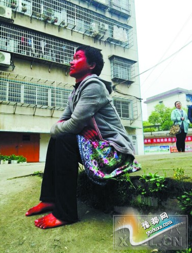 当天上午10点,在雨湖区广场街道福利社区我们见到了云南小伙朱晶芳,和今年1月见面时一样,朱晶芳依旧将脸部和手脚涂得通红、穿条碎花裙还光着脚。“只有这样的装扮,大家才不会漠视我,听我诉说我的故事!”