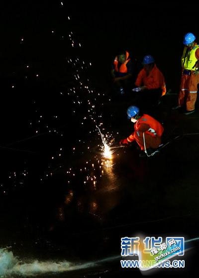 救援人员对客船“东方之星”轮的底部进行切割作业以便救援(6月3日摄)。 新华社记者 肖艺九 摄