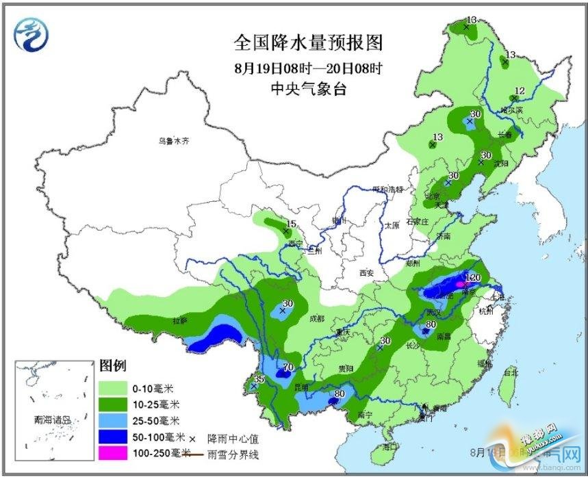 8月19日08时至20日08时,预计8月19日08时至20日08时,湖北东北部、河南东南部、湖南东北部、江西西北部、安徽中北部、江苏西部、云南东南部和西北部、广西西北部、川西高原北部、西藏东南部等地的部分地区有大雨或暴雨,其中安徽东部、江苏西部等地的局部地区有大暴雨(100~120毫米),上述局地并伴有短时强降水(最大小时雨强40~60毫米)、雷暴大风、冰雹等强对流天气。