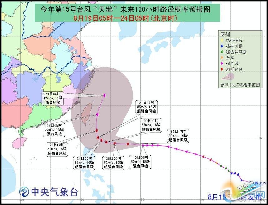 天气网讯 中央气象台最新预报,预计今年第15号台风“天鹅”(强台风级)将在8月22日前后于台湾东部近海转向北上,逐渐向我国东海南部海面靠近,登陆我国的可能性减小。
