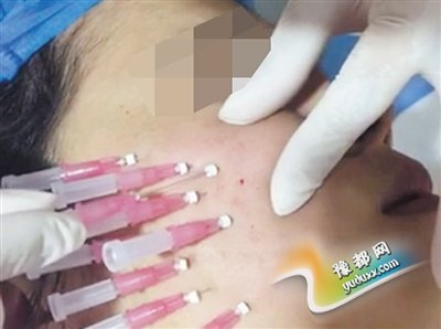耗时10余分钟的注射前半部分都很顺利,“专家”在拔出第二针时,细细的针尖刚离开鼻骨,一股血从针眼处喷出。“专家”赶紧拿起纱布,按在针眼上并安慰她说,“没事,没事”。