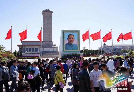 ????10月1日,巨幅孙中山画像矗立在天安门广场人民英雄纪念碑前。中新社记者 侯宇摄??