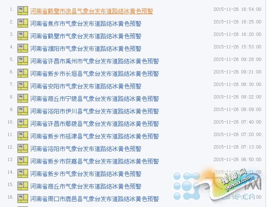 11月26日17时,大河网记者从河南省气象台获悉,因受低温影响,河南16地已发布道路结冰预警信号。受此影响,多条高速封闭。