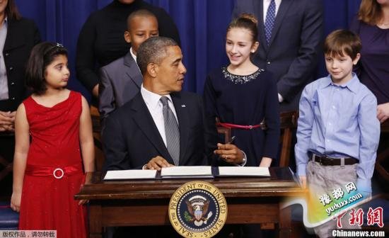 当地时间1月16日,美国华盛顿,美国总统奥巴马在白宫召开新闻发布会,公布了其23条新控枪举措。之后,奥巴马在副总统拜登、孩子们及家长的陪同下签署控枪行政命令。