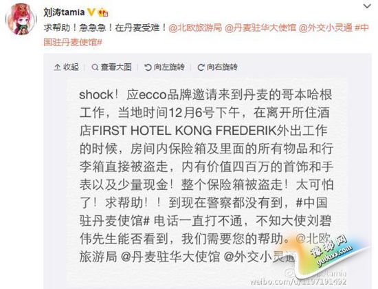 中新网12月7日电今日,女星刘涛在微博求助,称自己到丹麦首都哥本哈根工作时遭遇盗窃,所住酒店房间内的保险箱和行李被盗走,内有价值400万的首饰手表以及少量现金,“整个保险箱被盗走!太可怕了!求帮助!”此外,刘涛还晒出所住酒店的房卡。