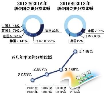 按照12月23日通过的2016年-2018年联合国经常预算的分摊比额,中国应缴纳会费比额从2013年-2015年的5.148%上升至7.921%,仅次于美国的22%和日本的9.68%,位居会员国第三位。
