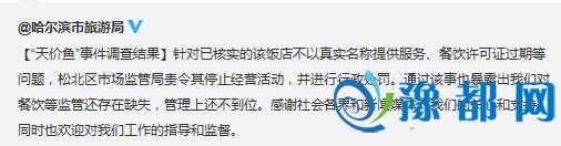 此外,哈尔滨市旅游局还通过官方微博称,“通过该事也暴露出我们对餐饮等监管还存在缺失,管理上还不到位。”并感谢社会各界和新闻媒体的关心和支持。