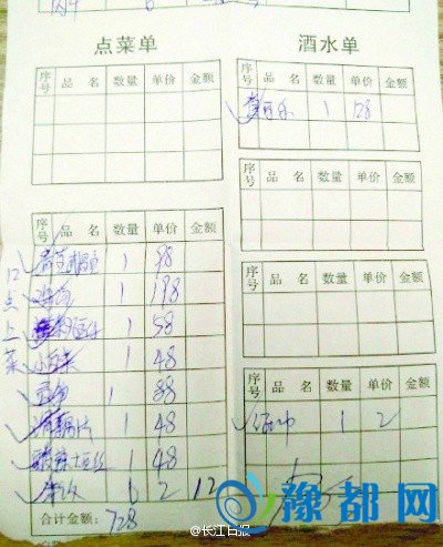 市民李先生告诉长江日报记者,2月17日,他邀请6名客户来到东湖边一家名为“海光水榭”的饭店就餐。“第一次来这家饭店,环境不错,就是菜价偏高。”李先生提供的点菜单显示,他点的7道菜中,武昌鱼98元,鸡汤198元,小白菜、酸辣土豆丝、滑藕片等均为48元。