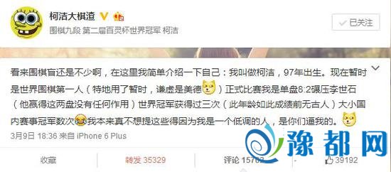 看来围棋盲还是不少啊,在这里我简单介绍一下自己:我叫做柯洁,97年出生。现在暂时是世界围棋第一人(特地用了暂时,谦虚是美德)正式比赛我是单盘8:2碾压李世石(他赢得这两盘没有任何作用)世界冠军获得过三次(此年龄如此成绩前无古人)大小国内赛事冠军数次我本来真不想提这些得因为我是一个低调的人,是你们逼我的。。哈萨比斯此前曾表示,他也期待“阿尔法围棋”能与中国高水平棋手对弈,“比如柯洁”。