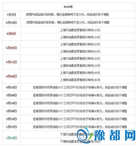国家发改委历次成品油价格调整汇总表。来源:隆众石化网