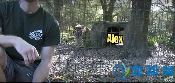 饲养员背朝笼子,蹲下没有多久,这名叫Alex的老虎就出现了,双眼紧紧的盯着他的背部。