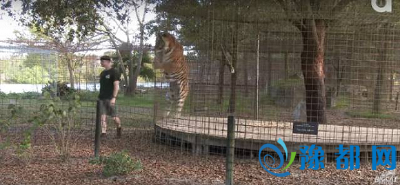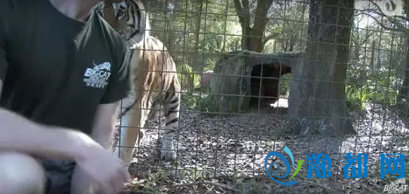 现在饲养员,背朝着笼子来回走动,可以看出这对老虎Andre是极大的诱惑。