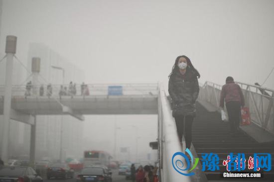 资料图:12月4日,戴着口罩的行人从天桥上走过。天津市气象台当日7时发布大雾橙色预警信号,天津大部分地区笼罩在大雾中,局部地区能见度低于200米。