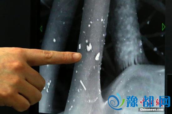 1月3日,北京化工大学高分子纳米复合材料实验室刘勇教授通过台式扫描电子显微镜,观察近期使用后的防霾鼻罩滤芯上采集的雾霾颗粒,以及分析雾霾颗粒里面含有的各种元素。近日,北京持续雾霾天气。中新社记者韩海丹 摄