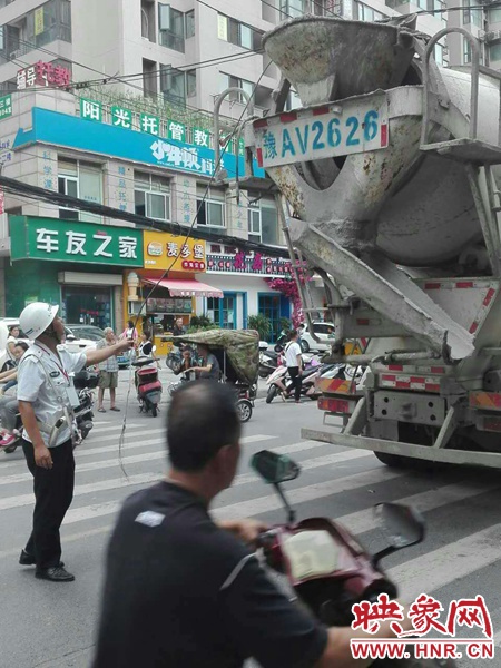9月8日下午14时40分,郑州人和路小学门口,一辆车牌号为豫AV2626的水泥罐车由西向东行驶,走到学校门口时,因为罐车超高,把马路中间线缆挂断。因线缆被挂断后垂落的太低,从此经过的车辆无法通行。