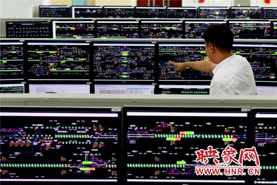 郑州铁路局调度所调度员通过CTC调度集中控制系统盯控高铁列车运行