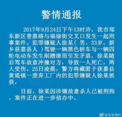 映象网快讯(记者 阮海峰)9月28日,郑州市公安局官方微博@平安郑州发布消息,郑州市郑东新区普惠路与福禄街交叉口发生一起刑事案件,犯罪嫌疑人徐某因涉嫌故意杀人已被警方刑拘。