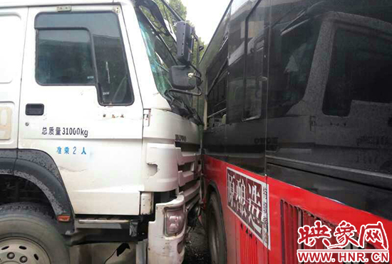 映象网快讯(记者 邱延波 文/图)9月30日下午,郑州市嵩山路上,一辆水泥罐车和公交车发生碰撞,致使公交车上的一名乘客受伤。