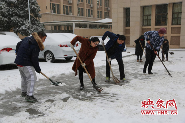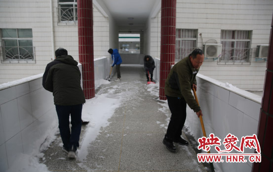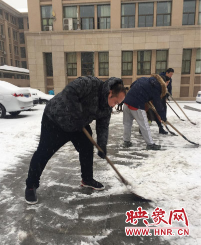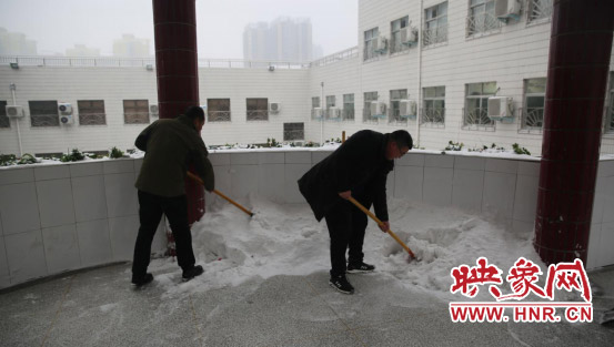 郑州二中。刚刚清理的好的地面又出现一层积雪,老师们只好再清理一遍,一早上就出了好几遍大汗。