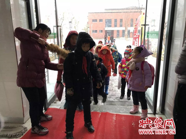 中牟文博路小学。值班教师李晨娟拿起抖雪神器“鸡毛掸”,为学生扫去身上的雪花。