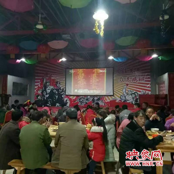 除夕夜,双房村村民齐聚在村里大食堂内吃年夜饭