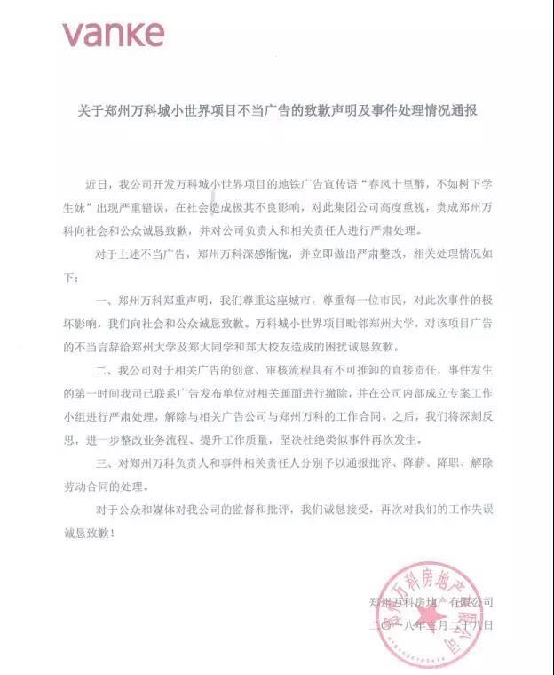 近日,我公司开发万科城小世界项目的地铁广告宣传语“春风十里醉,不如树下学生妹”出现严重错误,在社会造成极其不良影响,对此集团公司高度重视,责成郑州万科向社会和公众诚恳致歉,并对公司负责人和相关责任人进行严肃处理。
