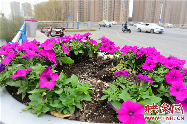 在金水路沙口路向南铁路桥上,路过的市民可以看到,路边摆着鲜花,争奇斗艳,让人心情舒畅,感叹郑州街头的漂亮。