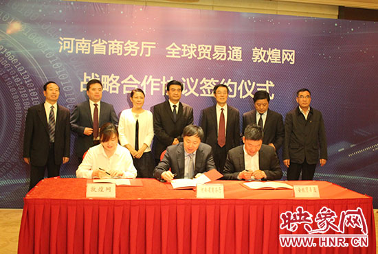 映象网讯 (记者 陈伟然 燕子丹 文/图)5月9日,河南省商务厅与全球贸易通、敦煌网战略合作协议签约仪式在郑州举行。据悉,省商务厅将支持两家企业以“河南省商务厅战略合作伙伴”身份与河南外贸企业接洽,在河南市场推广和业务拓展;支持其为河南外贸企业提供专业培训及人才孵化服务,改善企业传统经营思维和理念,提升企业电子商务应用水平,培养外贸专业人才。