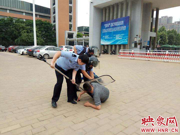上午10时,模拟警情下达:在中原西路郑州一中门口,有两名男子扬言要报复社会,持菜刀及木棍伤人。接警后,须水局立即按照处置突发案事件预案指令各单位组织警力携带单警装备、盾牌等必要装备和警械迅速赶赴现场。先期警力到达现场后,一边疏散围观群众,一边观察现场局面,同时迅速向分局领导和指挥中心汇报现场情况。支援警力到达现场后,在现场指挥员的指挥下,民警手持盾牌、警棍、钢叉等装备警械按照相关警务战术和程序分组依法对2名“嫌疑人员”实施成功抓捕,并带回单位进行调查处理。