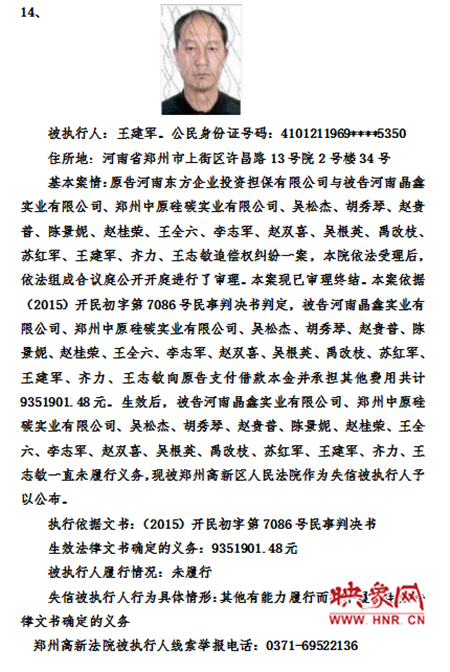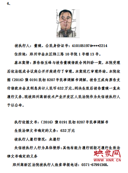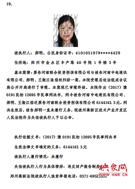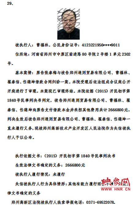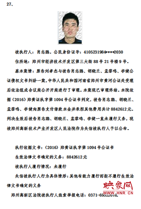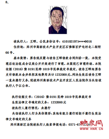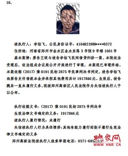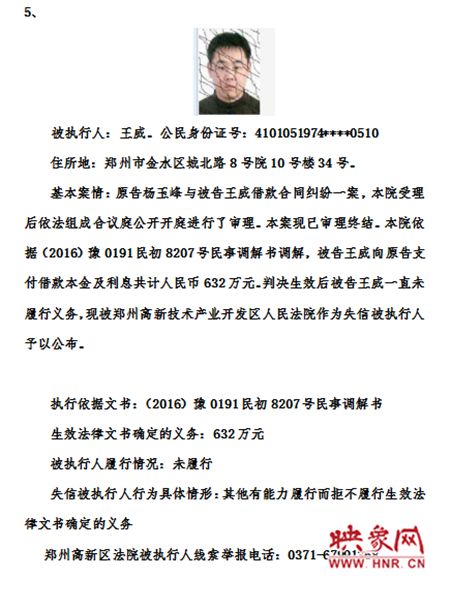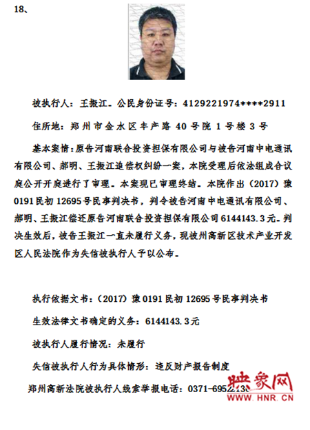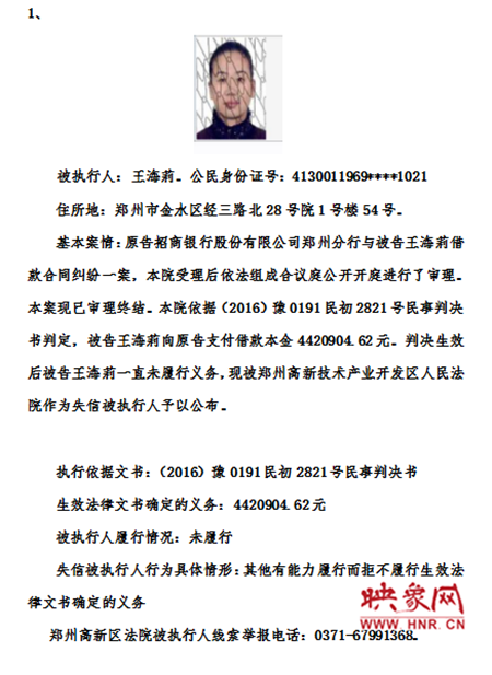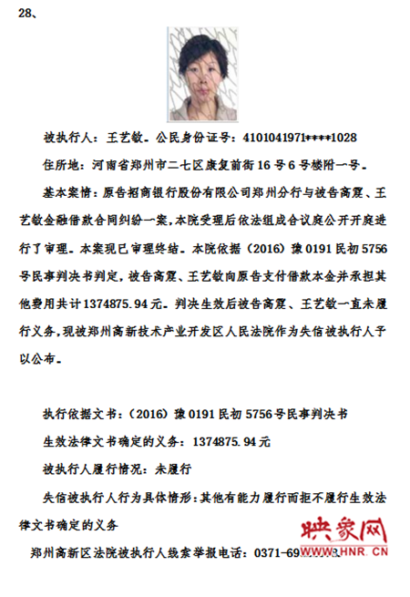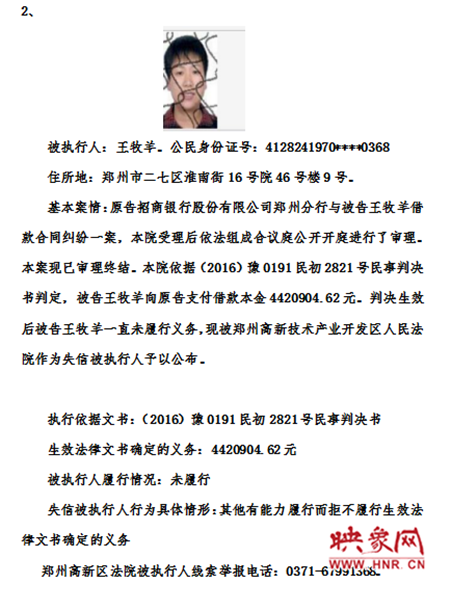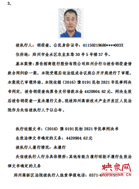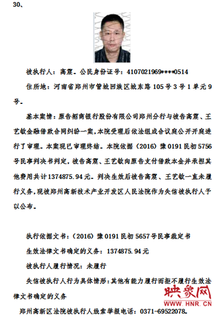 映象网讯(记者 王韶卿 通讯员 高云鹏 王琨 文/图)让“老赖”现形,建诚信郑州。映象网、郑州都市广播汽车912、郑州高新区法院联合打造“老赖”曝光平台,布下执行天罗地网,第三期曝光失信被执行人30名,希望社会各界予以监督,如有发现失信被执行人财产线索的请立即向郑州高新区法院执行局举报。