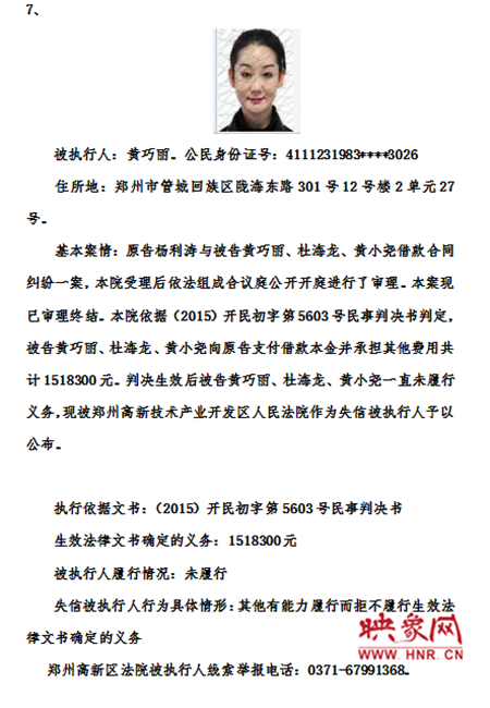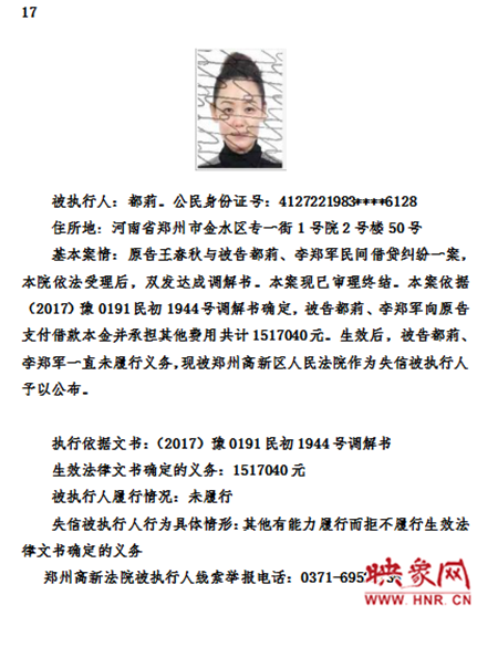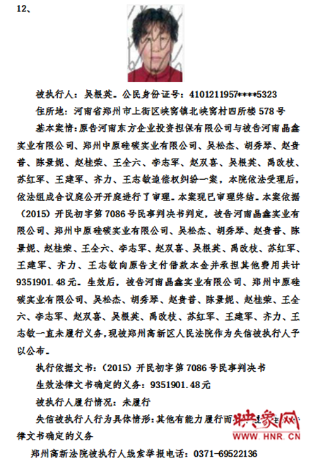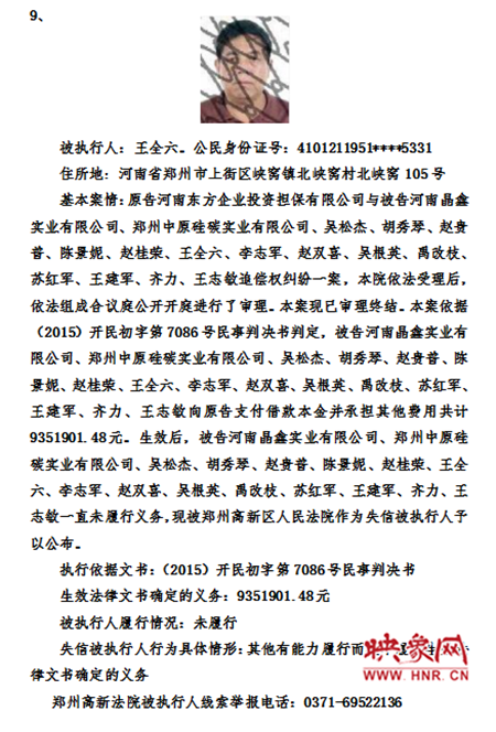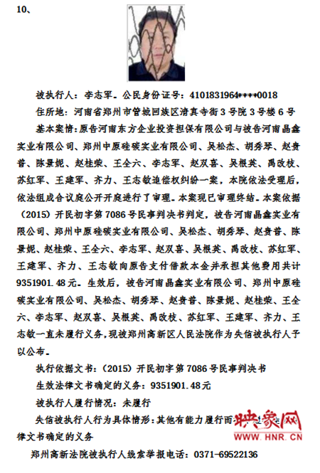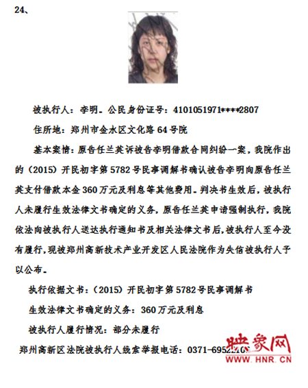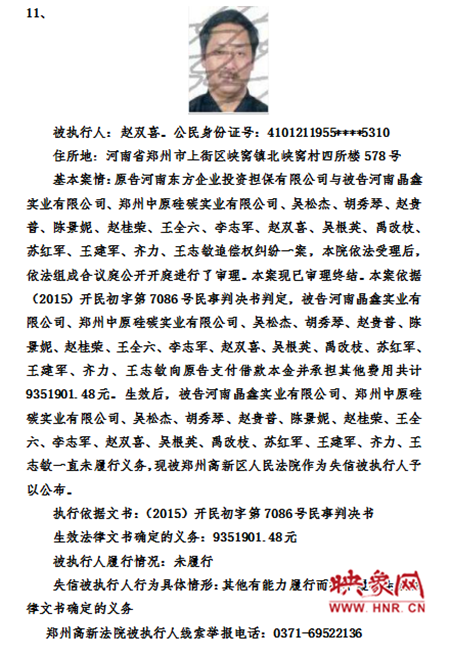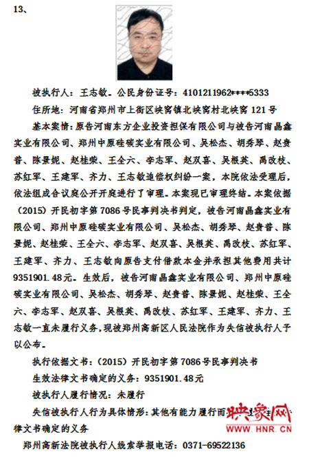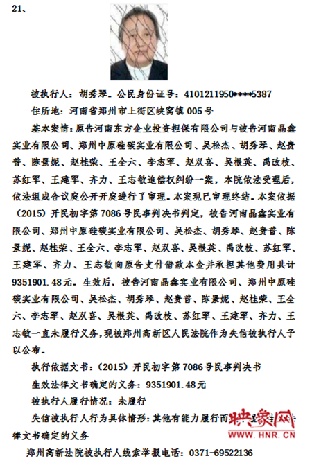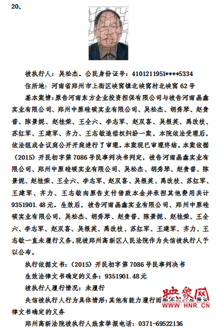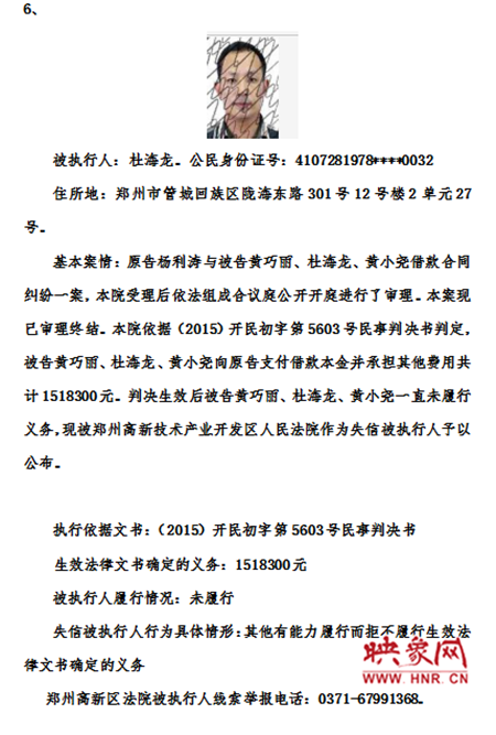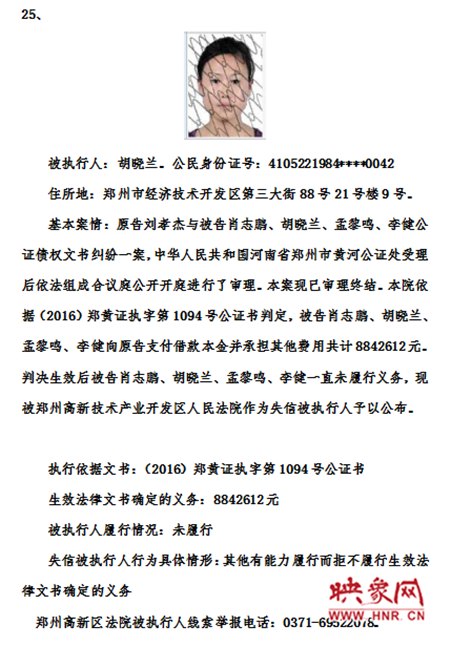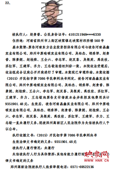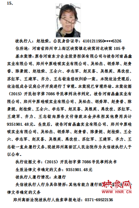 映象网讯(记者 王韶卿 通讯员 高云鹏 王琨 文/图)让“老赖”现形,建诚信郑州。映象网、郑州都市广播汽车912、郑州高新区法院联合打造“老赖”曝光平台,布下执行天罗地网,第三期曝光失信被执行人30名,希望社会各界予以监督,如有发现失信被执行人财产线索的请立即向郑州高新区法院执行局举报。