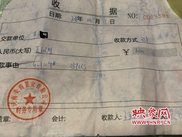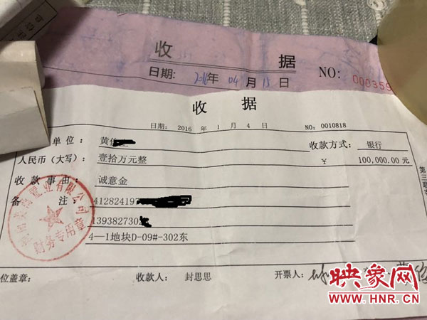 10时许,在郑东龙湖一号售房大厅内,张女士出示了她的交费收据。收据上写着黄先生的名字,日期为2016年1月4日,一张收据上写着“诚意金”10万元,另一张收据为1万元。盖着“河南美商置业有限公司”的财务专用章。张女士说,当时这个售楼部还没有建,开发商在郑东新区CBD设了售楼点,当时团购的几十家都在这里来交款,“我交了钱,他们让等,到时有人打电话通知让交余下的房款。我就在家里等。到2017年底,我也没有接到龙湖一号小区的电话。今年4月份,我就到这里来看房,问售楼部要不要交余下的房款时,发现我交11万定购的房,已经被别人买去了,我到房管局看时,果然网签过了。我交了11万元,连个电话费都不值?不管怎么说,应该提前给我电话联系一下啊。”张女士称,龙湖一号涉嫌一房两买。