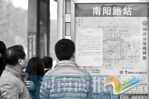 Å©ÒµÂ·ÑØÏß¿ìËÙ¹«½»Õ¾Ì¨²ð³ýǰ£¬ÊÐÃñÔÚ¿´Õ¾ÅÆÉϵĹ«¸æ¡£Õ¾ÅÆÉÏ£¬ÄÜ¿´µ½Ö£ÖݵĿìËÙ¹«½»Â·ÏßÍøÊ¾Òâͼ