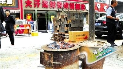 昨日下午4点20分左右,南阳路岗杜街口东100米路南,大汗烤羊腿、大汗海鲜烧烤旗舰店两个紧挨着的烧烤店前,零零散散的摆放着烧烤炉等。