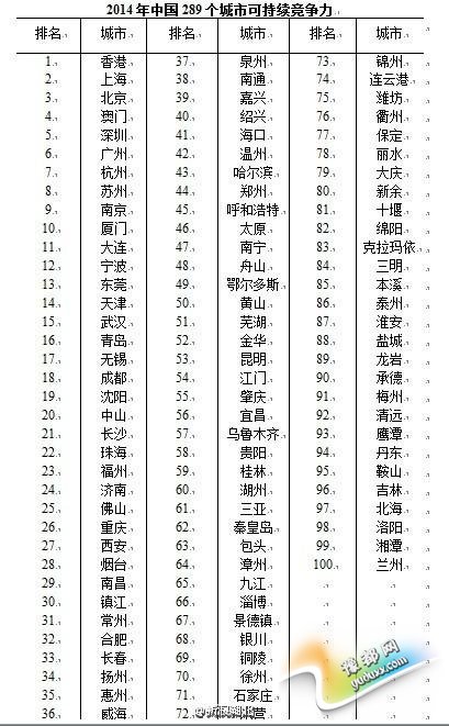 第二张榜单,是中国城市可持续竞争力的比较,这里面我们也给出了前五十名的城市的名单,我还是用一点点时间逐一的宣读一下。