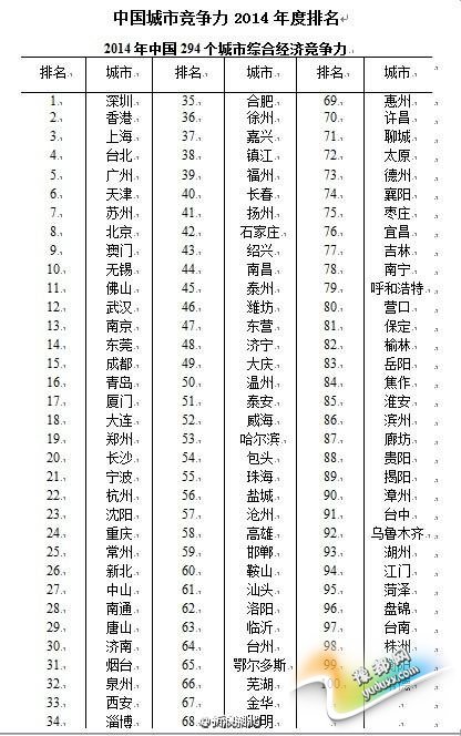 第十一名佛山、第十二名武汉、第十三名南京、第十四明东莞、第十五名成都、第十六名青岛、第十七名厦门、第十八名大连、第十九名郑州、第二十名长沙、第二十一名宁波、第二十二名杭州、第二十三名沈阳、第二十四名重庆、第二十五名常州,第二十六名台湾新北,第二十七名中山、二十八名南通、第二十九名唐山、第三十名济南、第三十一名烟台、第三十二名泉州、第三十三名西安、第三十四名淄博、第三十五名合肥、第三十六名徐州、第三十七名嘉兴,第三十八名镇江,第三十九名福州、第四十名长春、第四十一名扬州、第四十二名石家庄、第四十三名绍兴、第四十四名南昌、第四十五名泰州、第四十六名潍坊、第四十七名东营,第四十八名济宁、第四十九名大庆,第五十名温州。
