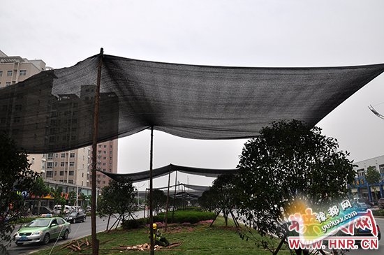 据现场的园林工人说,这些大叶石楠树是16日刚栽下的,有200多棵,由于此时已经接近盛夏,为了防止树木死亡,采取了多种保护措施。