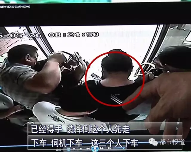 根据公交车上的监控显示,有两名男子站在该女子左右,挡住女子视线,另有一名男子在背后剪断项链并偷走,而此时翻倒的男子一直抱着女子的腿,装病发癫。